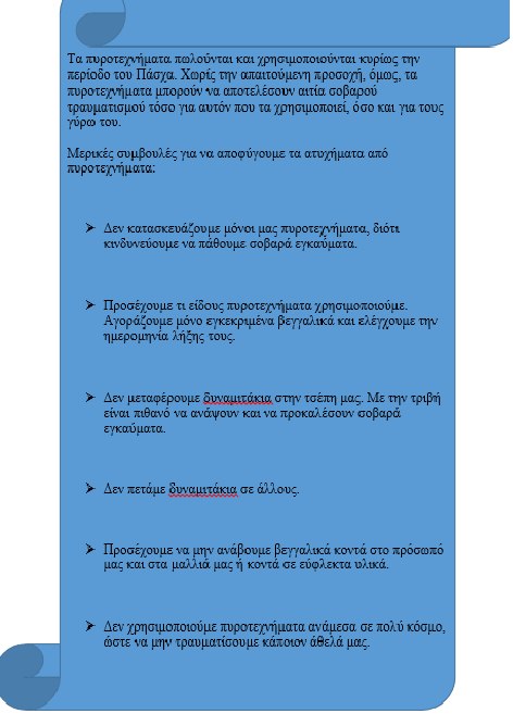 - Δεν κατασκευάζουμε μόνοι μας πυροτεχνήματα, διότι κινδυνεύουμε να πάθουμε σοβαρά εγκαύματα.